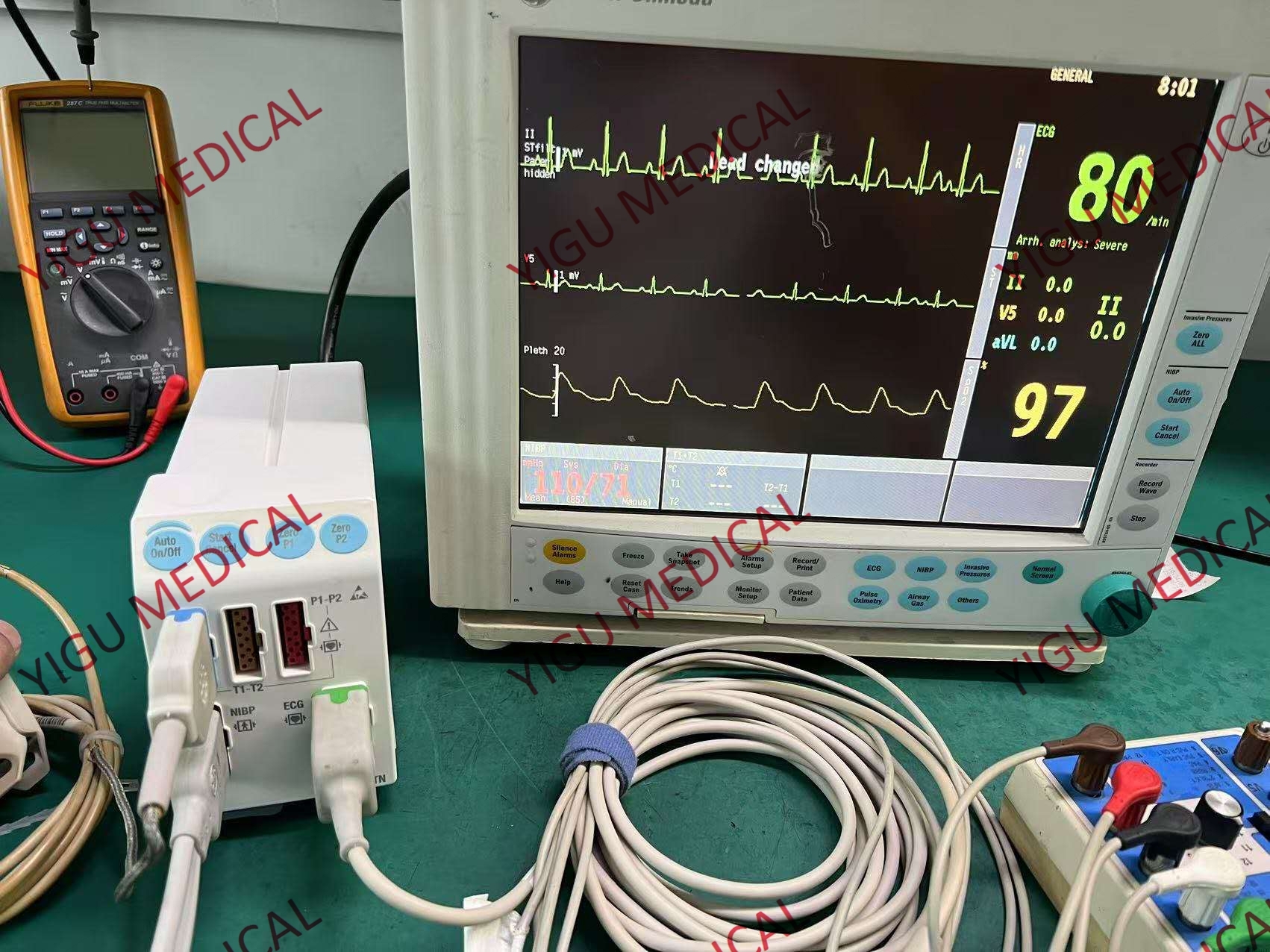 - Het kan een breed scala aan fysiologische parameters meten, waaronder een elektrocardiogram (ECG),die de elektrische activiteit van het hart weerspiegelt en helpt bij het opsporen van hartgerelateerde problemen zoals aritmieënEr is een niet-invasieve bloeddrukmeting (NIBP) beschikbaar, die informatie verstrekt over de systolische en diastolische bloeddruk om de bloedsomloopstatus van de patiënt te beoordelen.Het kan ook tot zes invasieve bloeddrukkanalen meten voor een meer diepgaande hemodynamische monitoring in sommige gevallenTemperatuur, zuurstofverzadiging (SpO2) en ademhalingsfrequentie zijn andere belangrijke parameters die het kan volgen.die nuttig is in anesthesie- en ademhalingszorgscenario's om de niveaus van relevante gassen of agentia te controleren.